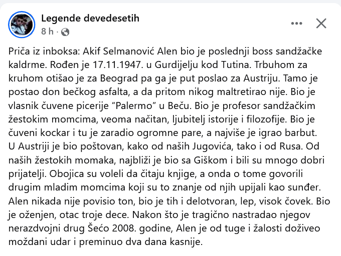 Beč i danas pamti ime Akifa Selmanovića Alena, čovjeka kojeg su mnogi opisivali kao gospodina sa asfalta, obrazovanog Sandžakliju i vlasnika čuvene pizzerije “Palermo”. Njegova životna priča, nedavno objavljena na popularnoj Facebook stranici “Legende devedesetih”, izazvala je veliki broj komentara i sjećanja.