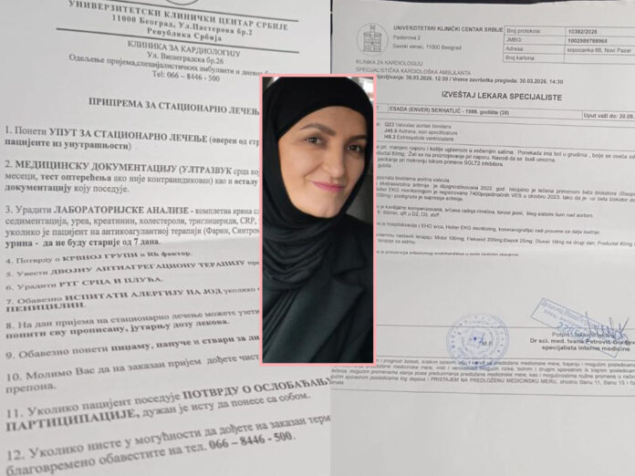 Prema medicinskoj dokumentaciji iz Univerzitetskog kliničkog centra Srbije, Esadi je dijagnosticirano ozbiljno srčano oboljenje – bikuspidna aortna valvula, uz prisustvo srčanih aritmija i drugih komplikacija koje joj svakodnevno otežavaju disanje, kretanje i normalan život. Ljekari su preporučili dalje liječenje, hospitalizaciju i operativni zahvat, jer stanje zahtijeva hitnu reakciju.