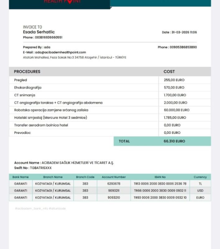 Prema predračunu renomirane bolnice u Turskoj, gdje bi Esada trebala biti operisana, ukupni troškovi liječenja iznose 66.310 eura. Riječ je o detaljno razrađenoj medicinskoj proceduri koja uključuje više faza pregleda, dijagnostike i same operacije. Kako se navodi u ponudi bolnice, troškovi su raspoređeni na sljedeći način: