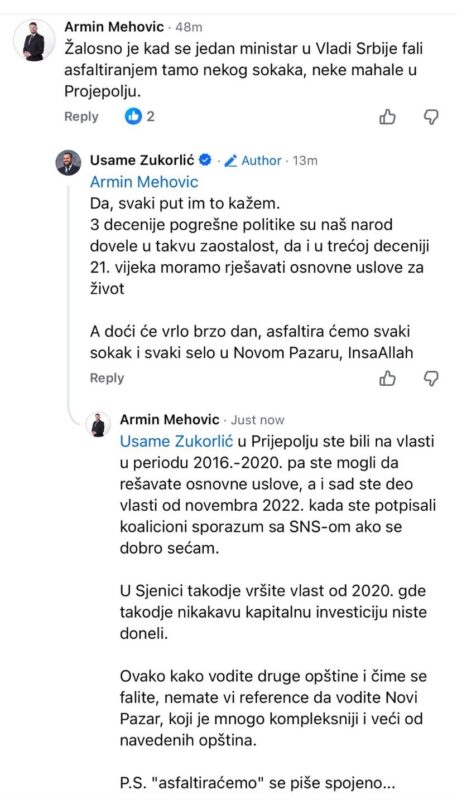 Glavni akteri? Ministar u Vladi Srbije, Usame Zukorlić – i odbornik SDP-a u Novom Pazaru, Armin Mehović, koji je pokazao kako izgleda kad neko zna i umije da “spusti na zemlju” političara bez argumenata. Sve je počelo naizgled bezazleno: ministar Zukorlić objavio je post hvaleći se asfaltiranjem “sokaka” u Prijepolju. To je izazvalo reakciju Armina Mehovića, koji mu je kratko i jasno poručio: