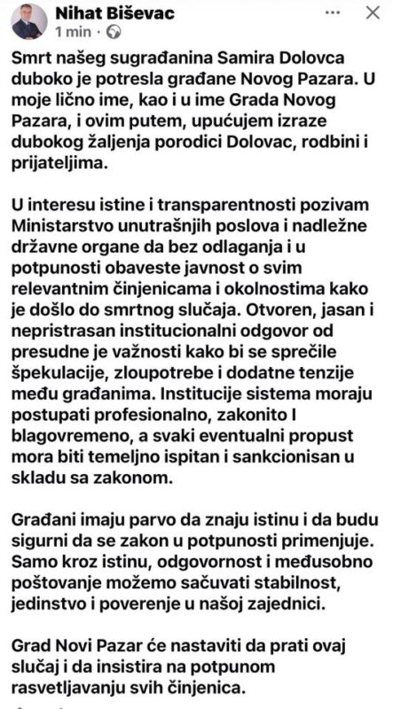 Gradonačelnik Nihat Biševac oglasio se povodom smrti sugrađanina Samira Dolovca, poručivši da je Novi Pazar duboko potresen ovim slučajem i da građani imaju pravo na potpunu i transparentnu istinu o svim okolnostima koje su dovele do tragičnog ishoda.