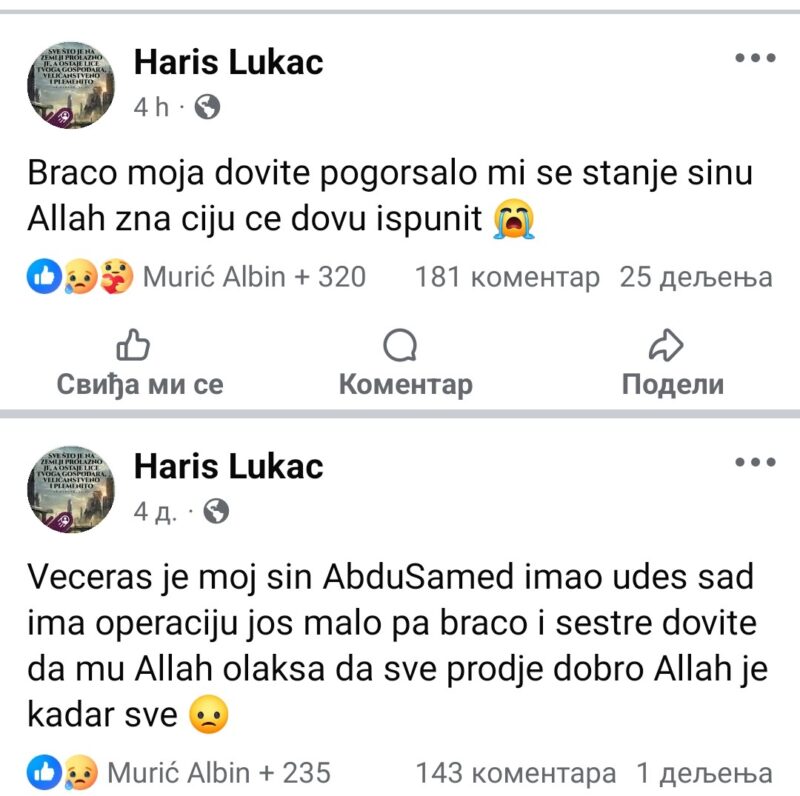 “Večeras je moj sin AbduSamed imao udes, sad ima operaciju još malo, pa braćo i sestre, dovite da mu Allah olakša da sve prođe dobro. Allah je kadar sve.”