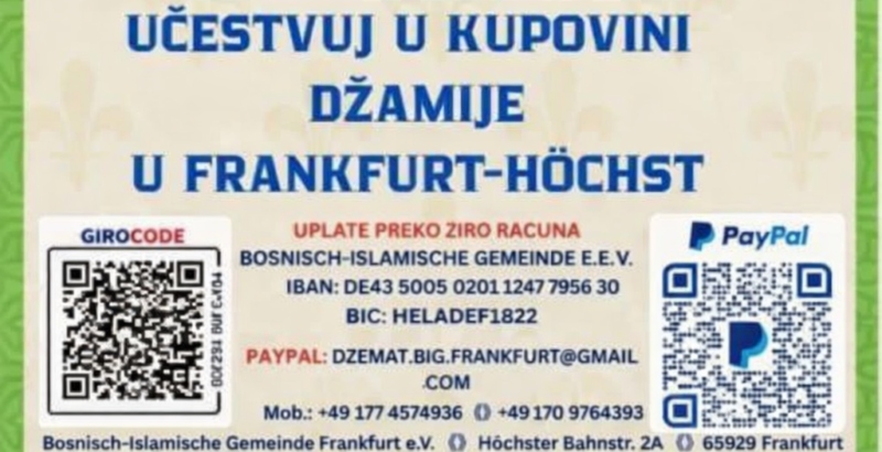 Frankfurt – Bošnjačka dijaspora u Njemačkoj pokrenula je novu humanitarnu i vjersku inicijativu s ciljem trajnog rješenja za svoje vjerske potrebe. Islamska zajednica „Bosnisch-Islamische Gemeinde Frankfurt e.V.“ pozvala je vjernike i sve ljude dobre volje da učestvuju u kupovini objekta koji bi bio pretvoren u džamiju u frankfurtskom naselju Höchst.
