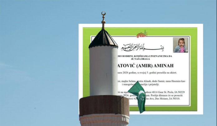 Dženaza-namaz će se obaviti u nedjelju, 8. februara 2026. godine, u 12:00 sati, na mezarju “Ezan”, na adresi 4814 Gear S. Prole, IA 50229.