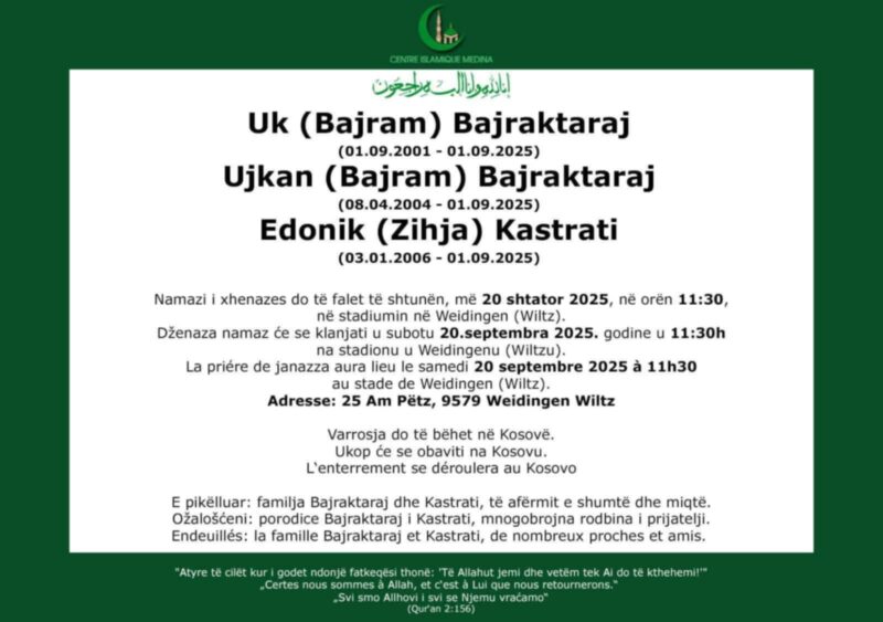 Dženaza-namaz će se klanjati u subotu, 20. septembra 2025. godine u 11:30 sati na stadionu u Weidingenu (Wiltz).