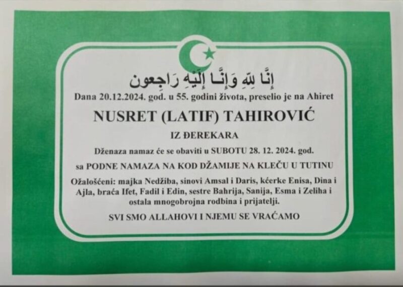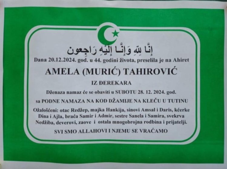 Nusret (55) i Amela (44) Tahirović iz Tutina tragično su izgubili živote u saobraćajnoj nesreći koja se dogodila u Mađarskoj, blizu grada Segedina. Prema dostupnim informacijama, nesreća je izazvana gustom maglom i umorom vozača, uslijed čega je njihov automobil udario u kamion. Njihovo troje djece, koje je bilo s njima u automobilu, zadobilo je povrede, ali se nalaze van životne opasnosti.