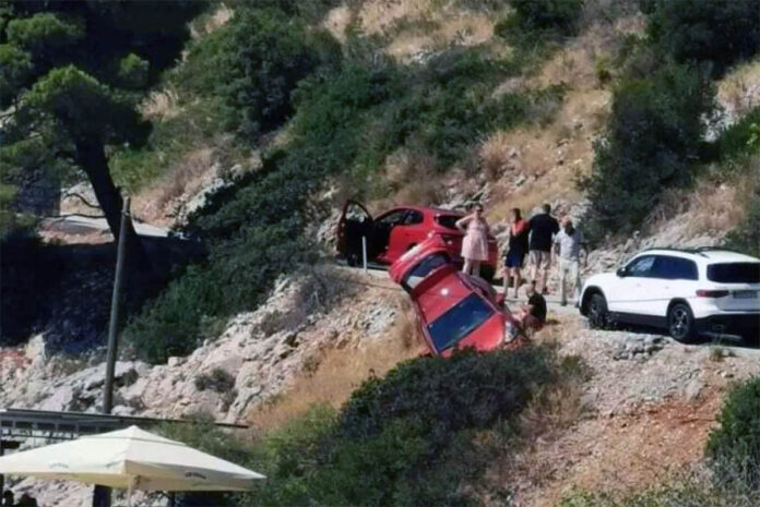 Na fotografijama s lica mjesta vidi se crveni automobil nasukan na padini iznad kafića, dok su u neposrednoj blizini okupljeni prolaznici i drugi vozači.