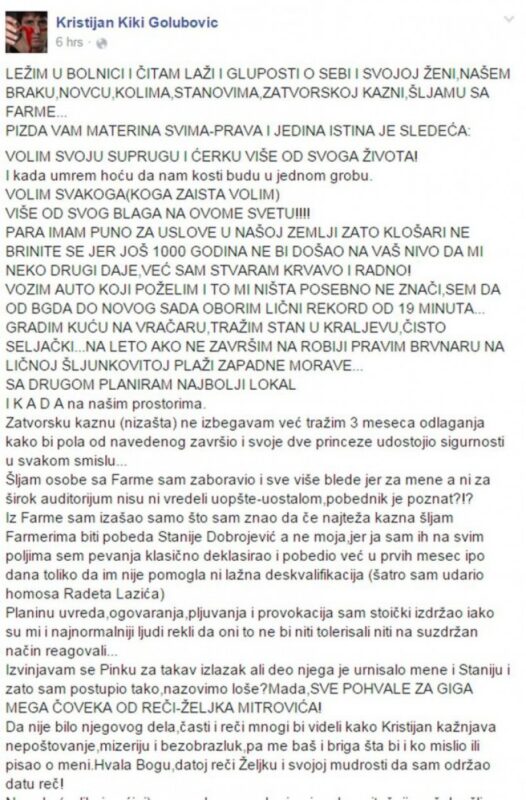 Golubović je tada objavio još jednu, znatno opširniju poruku iz bolnice, u kojoj se osvrnuo na, kako kaže, niz neistina koje se o njemu plasiraju u javnosti – od porodičnih odnosa, imovine i novca, do zatvorske kazne i učešća u rijaliti programima.