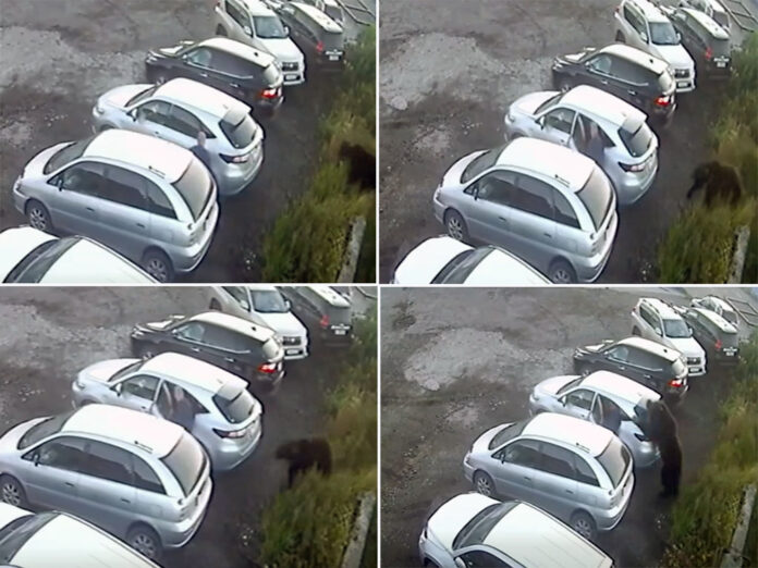 Nevjerovatan snimak sa nadzorne kamere iz regije Kamčatka u Rusiji prikazuje dramatične trenutke kada se muškarac našao licem u lice s ogromnim medvjedom na parkingu.