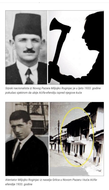 Prema savremenim izvorima, prvi poznati pokušaj atentata na gradonačelnika Novog Pazara i narodnog predstavnika Aćifa Hadžiahmetovića (Aćif-efendiju) dogodio se tokom leta 1933. godine. Napadač je, kako navodi sandžački istoričar Husein-aga Zatrić, bio lokalni srpski nacionalista Milojko Roginjac iz naselja Grlica. Roginjac je sačekao efendiju ispred njegove porodične kuće u tadašnjem Ćerćiskom sokaku (današnjoj ulici Gojka Bačanina) i noću ga sa leđa napao sjekirom. Ulice su bile slabo osvetljene, ali je Aćif-efendija na vreme opazio senku napadača, okrenuo se i uspeo da mu istrgne sjekiru iz ruke. Njegovi komšije brzo su istrčali i pritrčali u pomoć povređenom efendiji. Iako je zadobio teže povrede po glavi i ramenu, Aćif je preživeo napad.