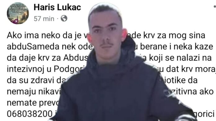 “Ako ima neko da je voljan da dade krv za mog sina AbduSameda, nek ode u bolnicu u Berane i neka kaže da daje krv za Abdusameda Lukača koji se nalazi na intenzivnoj u Podgorici. Osobe koje mogu dati krv moraju da su zdrave, da ne primaju antibiotike i da nemaju nikakvih upala. Krvna grupa je A pozitivna. Ako nemate prevoz, možete se meni obratiti na broj +38268038200. Isto tako, krv može da se da i u Podgorici, samo da se naznači za koga je.”