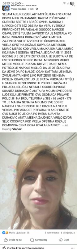 Rožaje – U mjestu Vrelo, selo Ćosovica kod Rožaja, nestala je Suanita (Anita) Duraković, supruga Mersudina Murića. Porodica je prijavila njen nestanak Policijskoj stanici u Rožajama nakon što je u subotu, 8. novembra 2025. godine, u ranim jutarnjim satima, primijećeno da nije u porodičnoj kući.