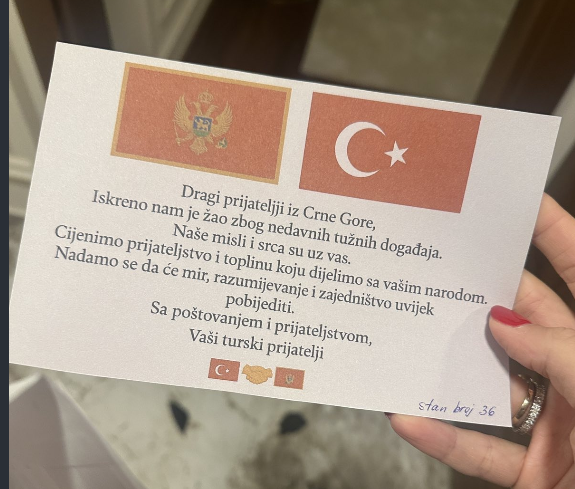 “Dragi prijatelji iz Crne Gore, iskreno nam je žao zbog nedavnih tužnih događaja. Naše misli i srca su uz vas. Cijenimo prijateljstvo i toplinu koju dijelimo sa vašim narodom. Nadamo se da će mir, razumijevanje i zajedništvo uvijek pobijediti.