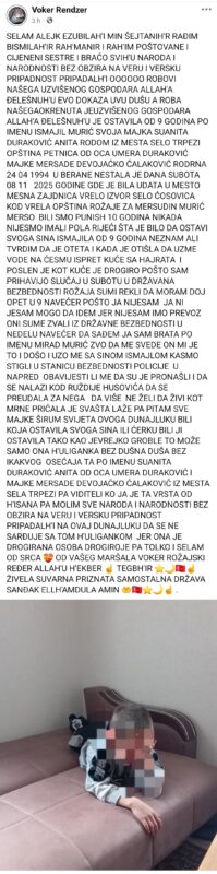 “Evo dokaza, u ovu dušu a roba našega Gospodara Allah’a – ostavila je sina od devet godina po imenu Ismail. Nestala je 8. novembra 2025. godine, a nije poznato gdje se trenutno nalazi. Rekli su mi iz policije da ću biti obaviješten ako se pronađe”, stoji u objavi.