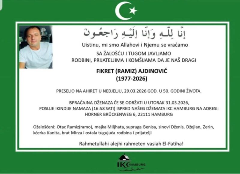 Njegov život bio je tiha, ali snažna poruka o ljudskosti. Oni koji su ga poznavali ističu da je uvijek nalazio način da pruži podršku, podigne raspoloženje i ulije nadu, čak i u najtežim trenucima. Dženaza u Hamburgu bit će prilika da mu posljednji selam upute prijatelji iz dijaspore, ali i svi oni koji su imali čast da ga upoznaju. Neka mu Uzvišeni Allah podari Džennet, a njegovoj porodici sabur u ovim teškim trenucima.