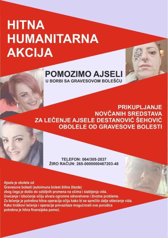 Pokrenuta je hitna humanitarna akcija za Ajselu Destanović Šehović, bivšu saobraćajnu policajku koja je dok je radila bila izuzetno cijenjena i voljena među građanima. Ajsela je danas suočena sa teškom životnom borbom – oboljela je od Gravesove bolesti, autoimune bolesti štitne žlijezde, koja je dovela do ozbiljnih promjena na očima i naglog slabljenja vida.