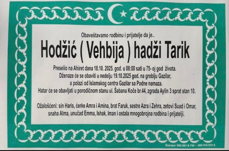 Hadži Tarik Hodžić preselio je na Ahiret 18. oktobra 2025. godine, u 08:00 sati, u 75. godini života. Dženaza će se obaviti u nedjelju, 19. oktobra 2025. godine, na groblju Gazilar, a povorka kreće od Islamskog centra Gazilar nakon podne-namaza. Hatar će se obavljati u porodičnom stanu u ulici Šabana Koče br. 44, zgrada Aylin, 3. sprat, stan 10.