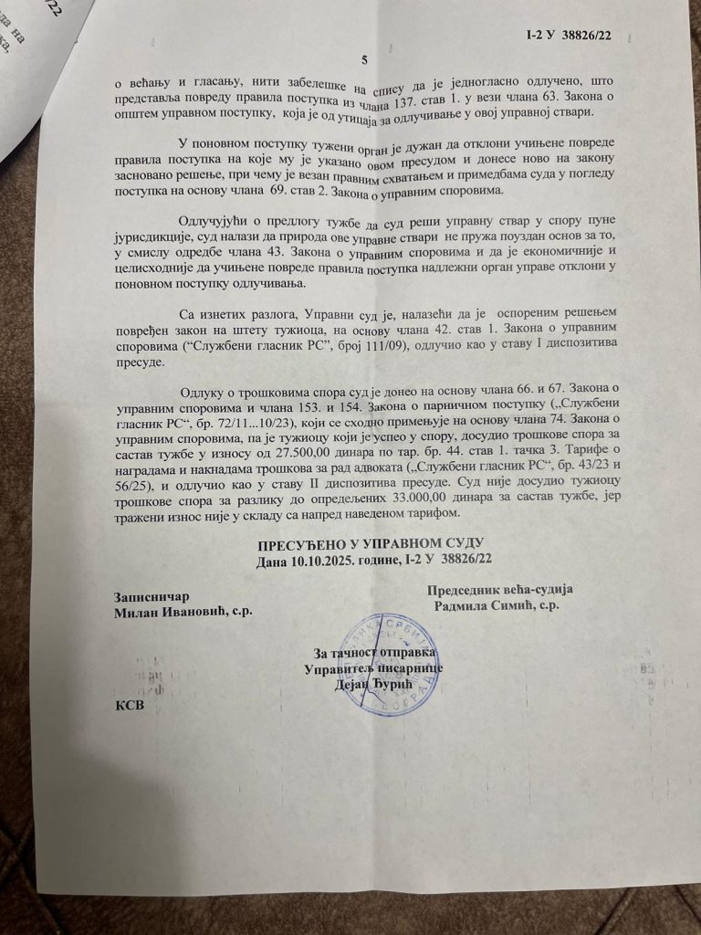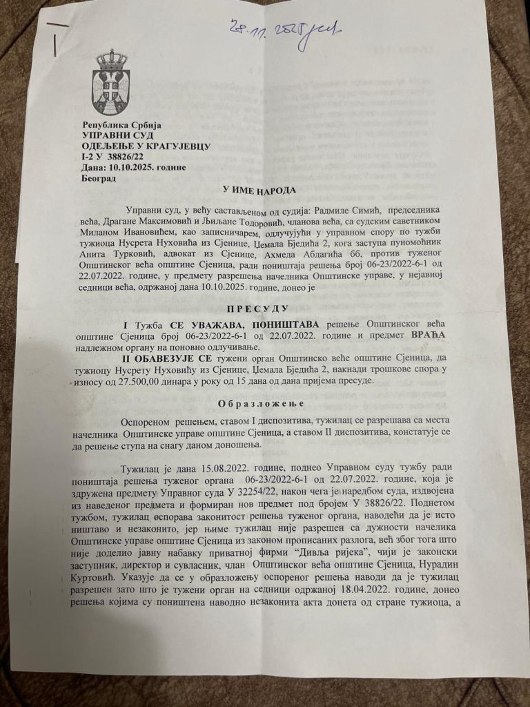 Upravni sud u Kragujevcu donio je pravosnažnu presudu kojom je uvažena tužba Nusreta Nuhovića iz Sjenice i poništeno rješenje Opštinskog vijeća iz jula 2022. godine, kojim je bio razriješen dužnosti načelnika Opštinske uprave. Sud je naložio da se čitav postupak vrati na ponovno odlučivanje, uz obavezu da se otklone sve utvrđene nepravilnosti, a Nuhović vraća na posao do okončanja zakonitog postupka.