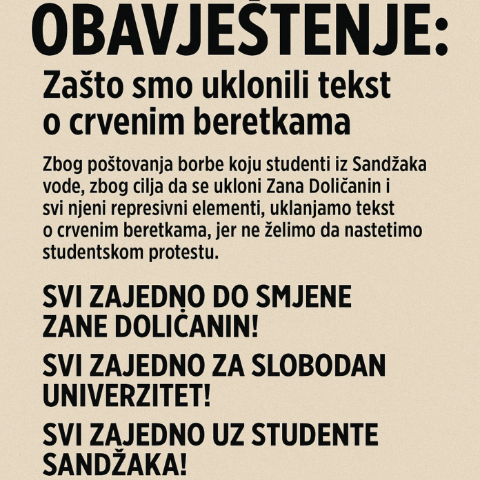 Zbog iskrenog poštovanja prema hrabroj i istrajnoj borbi studenata iz Sandžaka, koji ovih dana vode odlučujuću bitku za dostojanstvo obrazovanja i smjenu direktorice Državnog univerziteta u Novom Pazaru, Zane Doličanin, redakcija je donijela odluku da ukloni tekst o prisustvu crvenih beretki na protestima.