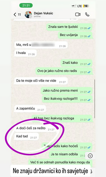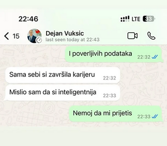 Bivša državna sekretarka u Ministarstvu ljudskih i manjinskih prava Crne Gore Mirjana Pajković objavila je na svom Instagram profilu dio prepiski i audio-snimaka za koje tvrdi da svjedoče o prijetnjama koje je dobijala od Dejan Vukšić, nekadašnjeg direktora Agencije za nacionalnu bezbjednost i bivšeg savjetnika predsjednika Crne Gore.
