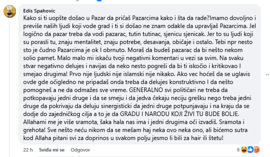 Dok jedni smatraju da je kritika vlasti nužna i opravdana, drugi, poput Spahovića, ističu da način komunikacije mora biti odgovoran i usmjeren ka rješenjima, a ne ka produbljivanju nezadovoljstva. Jasno je da društvene mreže sve više postaju prostor gdje se vodi javni dijalog, ali i mjesto gdje građani očekuju više – ne samo riječi, već konkretna djela. Pogledajte raspravu ispod teksta.