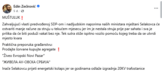 Zećirović je u svojoj objavi, uz dozu sarkazma, naveo da će mještani Selakovca imati “manje račune za struju” jer je došlo do nestanka električne energije, dodajući kako se kvar još uvijek utvrđuje i da bi prekid mogao potrajati. Posebno je pažnju izazvala njegova poruka građanima da “prodaju šporete i kupuju agregate”, kao i završne politički intonirane poruke. Ipak, ono što je uslijedilo izazvalo je još veći odjek.