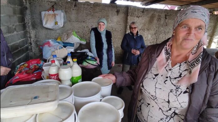 Na drugom kraju pijace Sadija iz Sjenice prodaje sir, kajmak i maslo. Sve uredno upakovano u tegle i kante, kao u prodavnici. „Sve sami radimo. Od krava, sira, mlijeka, sve domaće. Navikli smo na sve, jaki smo ljudi. Kod nas nema da se ne može.“