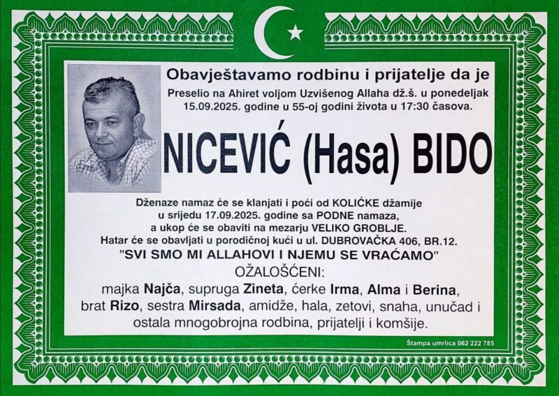 Prema objavljenoj čitulji, dženaza namaz će se klanjati i povorka će krenuti od Kolićke džamije u srijedu, 17. septembra 2025. godine, nakon podne namaza. Ukop će se obaviti na mezarju Veliko groblje, dok će hatar biti obavljan u njegovoj porodičnoj kući u ulici Dubrovačka 406, br. 12.
