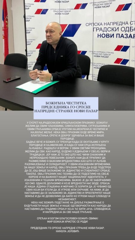 Predsjednik Gradskog odbora Srpske napredne stranke u Novom Pazaru, Nikola Jolović, uputio je čestitku povodom Božića svim članovima, simpatizerima, sugrađanima i građanima Srbije, izrazivši iskrene želje za mirom, blagostanjem i zdravljem u ovim prazničnim danima. U svom obraćanju istakao je značaj Božića kao praznika koji okuplja porodice i podsjeća na temeljne vrijednosti ljubavi, vjere i tradicije. Jolović je naglasio kako Božić pruža priliku za promišljanje o solidarnosti, razumijevanju i važnosti jedinstva, posebno u izazovnim vremenima kroz koja prolazi i narod i država.