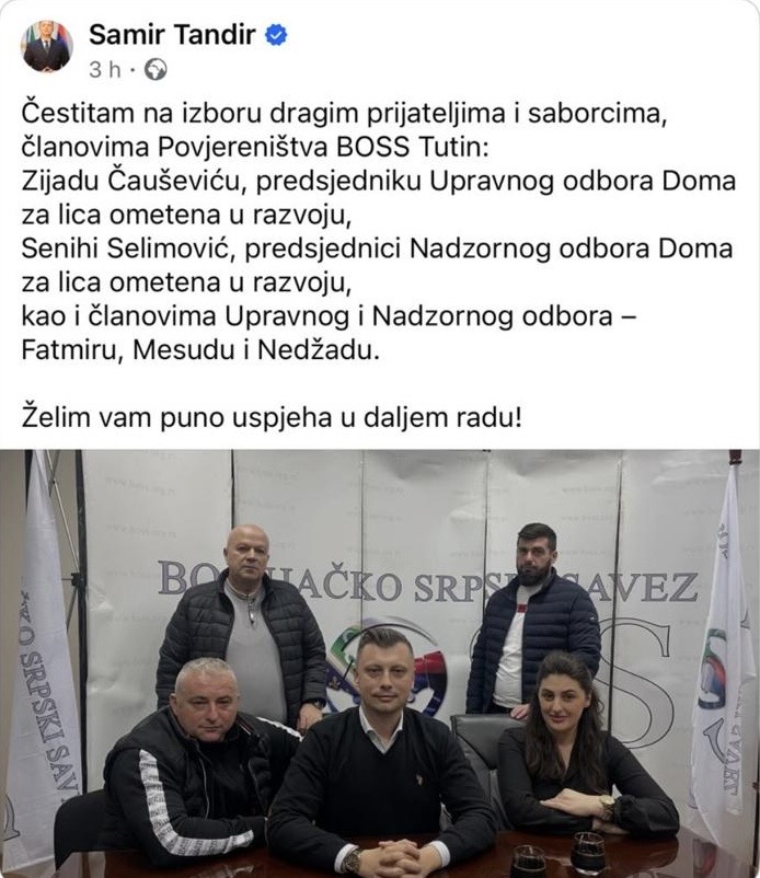 „Čestitam na izboru dragim prijateljima i saborcima, članovima Povjereništva BOSS-a Tutin: Zijadu Čauševiću, predsjedniku Upravnog odbora Doma za lica ometena u razvoju, Senihi Selimović, predsjednici Nadzornog odbora Doma za lica ometena u razvoju, kao i članovima Upravnog i Nadzornog odbora – Fatmiru, Mesudu i Nedžadu. Želim vam puno uspjeha u daljem radu.“