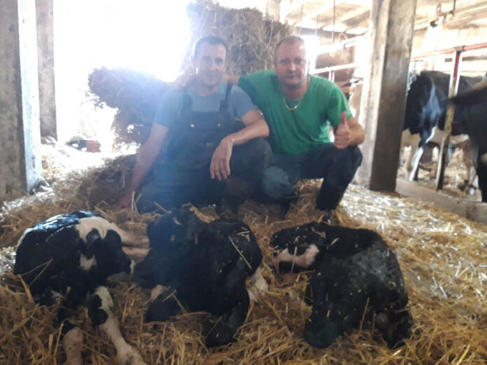 Na fotografiji iz štale domaćinstva vidi se sretni vlasnik zajedno sa prijateljem, dok ispred njih leže tri zdrava i živahna teleta, što je rijedak prizor i za najiskusnije poljoprivrednike.