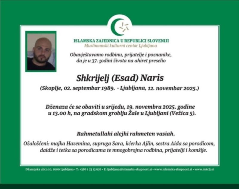 Velika tuga pogodila je sandžačku dijasporu u Sloveniji nakon vijesti da je u 37. godini života preselio Naris (Esad) Škrijelj, porijeklom iz sandžačke porodice koja se ranije preselila u Sjevernu Makedoniju. Njegov prerani odlazak potresao je rodbinu, prijatelje i širu zajednicu, posebno zbog činjenice da je nedavno postao otac.