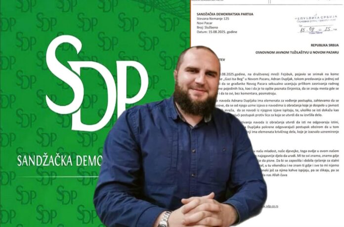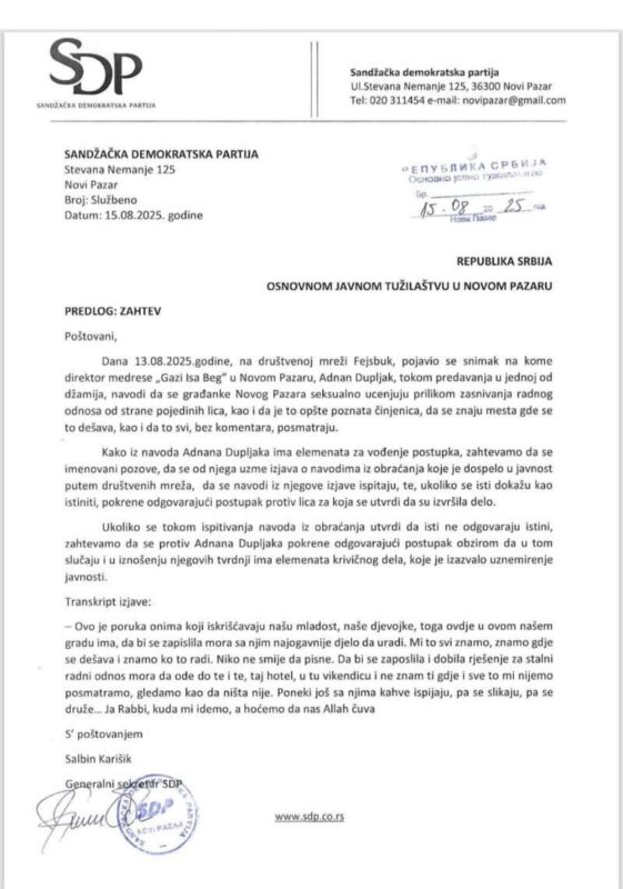 Sandžačka demokratska partija (SDP) uputila je zvaničan zahtev Osnovnom javnom tužilaštvu u Novom Pazaru da se ispitaju navodi koje je direktor medrese „Gazi Isa-beg“, Adnan Dupljak, izneo tokom javnog obraćanja, a koji su izazvali veliku pažnju i uznemirenje javnosti.