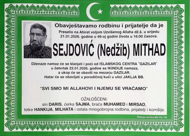 „Naš brat Sejdović Mithat preselio je svome Gospodaru. Bio je invalid, nije mogao da radi, živio je oskudno, ali bio je pošten čovjek, insan od namaza i dobročinitelj. Iza sebe je ostavio dvoje djece. Smatram da tu djecu trebamo uzeti u emanet, svako prema svojim mogućnostima. Također, dženazu i troškove oko dženaze trebamo mi, braća, pokriti. Ja ću dati od svoga imetka i pozivam i vas da udijelite koliko možete.“