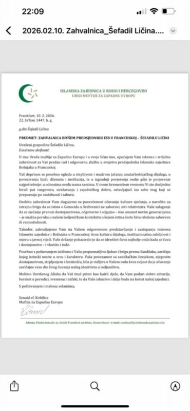 Nedavna zahvalnica Ureda muftije za Zapadnu Evropu Islamske zajednice u Bosni i Hercegovini, upućena Šefadilu Ličini za njegov rad i doprinos među Bošnjacima u Francuskoj, još jednom je potvrdila ono što dijaspora već dugo zna – da je riječ o čovjeku koji je godine svoga života ugradio u jačanje identiteta, zajedništva i institucionalne ozbiljnosti bošnjačke zajednice. Dok mu u Frankfurtu, Parizu i drugim evropskim centrima odaju priznanja za odgovornu službu, jačanje dijaloga i očuvanje kulture sjećanja, u Sandžaku se o njegovom radu često govori tiho – ili se, još gore, prešućuje.