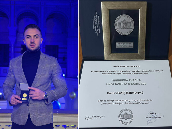 SARAJEVO / SJENICA – U ambijentu Gradska vijećnica Sarajevo, simbolu kulturnog i akademskog identiteta glavnog grada, Damir (Fadil) Mahmutović, porijeklom iz Sjenice, primio je Zlatnik Grada Sarajeva za izuzetna akademska postignuća. Time je zaokružio godinu u kojoj je prethodno ovjenčan i Srebrnom značkom Univerziteta u Sarajevu, jednim od najviših univerzitetskih priznanja.