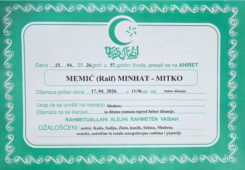 Dženaza Mithatu Memiću klanjat će se 17. aprila u 13:30 sati ispred Sabur džamije, a ukop će biti obavljen na mezarju Medare. Iza njega je ostala ožalošćena porodica, ali i cijela Sjenica koja ga danas ispraća sa suzama i dovama. Neka mu Allah podari najljepše mjesto u Džennetu. Ožalošćeni: sestre Kada, Sadija, Zlata, Hanifa, Selima i Minheta, sestrići, sestrične, kao i ostala mnogobrojna rodbina, prijatelji i građani Sjenice.