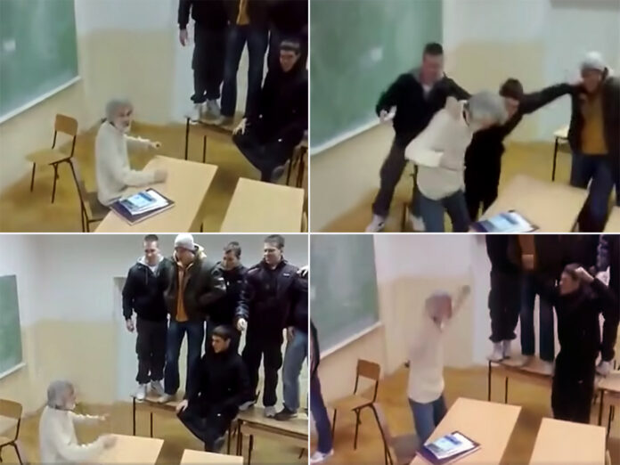 Beograd – Društvenim mrežama kruži uznemirujući snimak iz jedne srednje stručne škole u Beogradu, koji prikazuje profesora kako sjedi za katedrom i, umjesto vođenja nastave, rukama diriguje grupi učenika koji stoje na klupama i glasno izgovaraju parole s vulgarnim i seksualno eksplicitnim sadržajem.