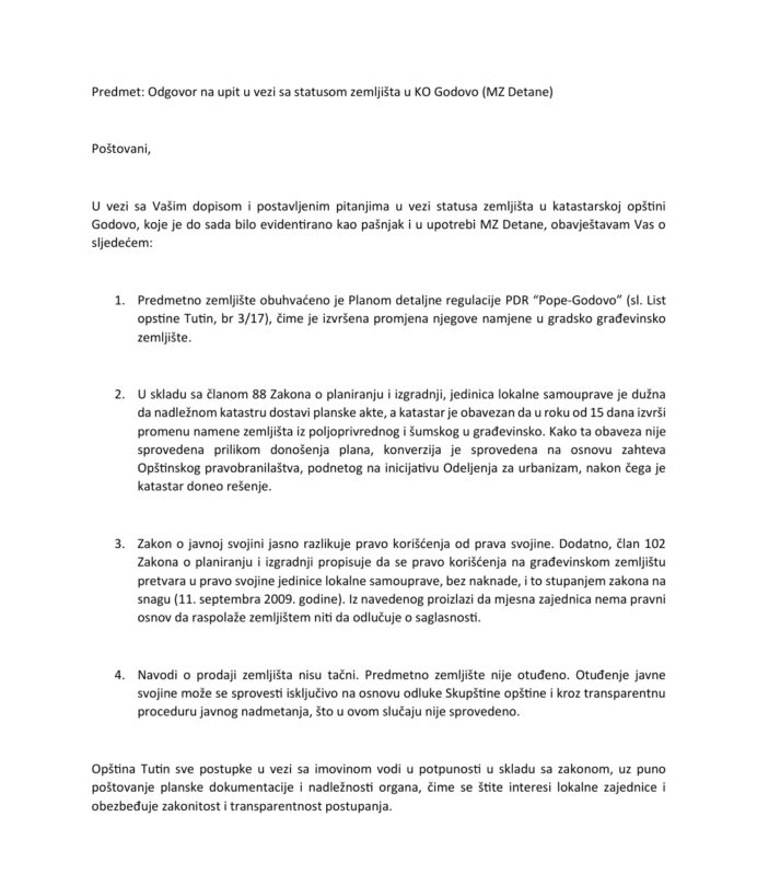 TUTIN – Nakon što je portal Sandžak Danas objavio kritički tekst o konverziji i mogućoj prodaji 15 hektara zemljišta u katastarskoj opštini Godovo (MZ Detane), Opština Tutin uputila je zvaničan odgovor redakciji. U saopštenju se tvrdi da zemljište nije otuđeno i da je postupak sproveden u skladu sa zakonom i planskom dokumentacijom.