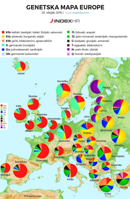 Genetska mapa Evrope (Y-DNK haplogrupe po državama; Izvor: Eupedia/Index.hr). Svaka boja predstavlja jednu Y-haplogrupu i približno porijeklo: npr. crveno = R1b (zapadnoevropske: „keltske, italske“ linije), zeleno = I2 (dinarsko-balkanska linija, tzv. ilirski gen), žuto = R1a (istočnoevropska „slovenska“ linija), plavo = E1b (bliskoistočno-severnoafrička linija), ljubičasto = J2 (mediteransko-bliskoistočna linija) itd. Grafički prikazi (pite) pokazuju udio haplogrupa u populaciji svake zemlje.