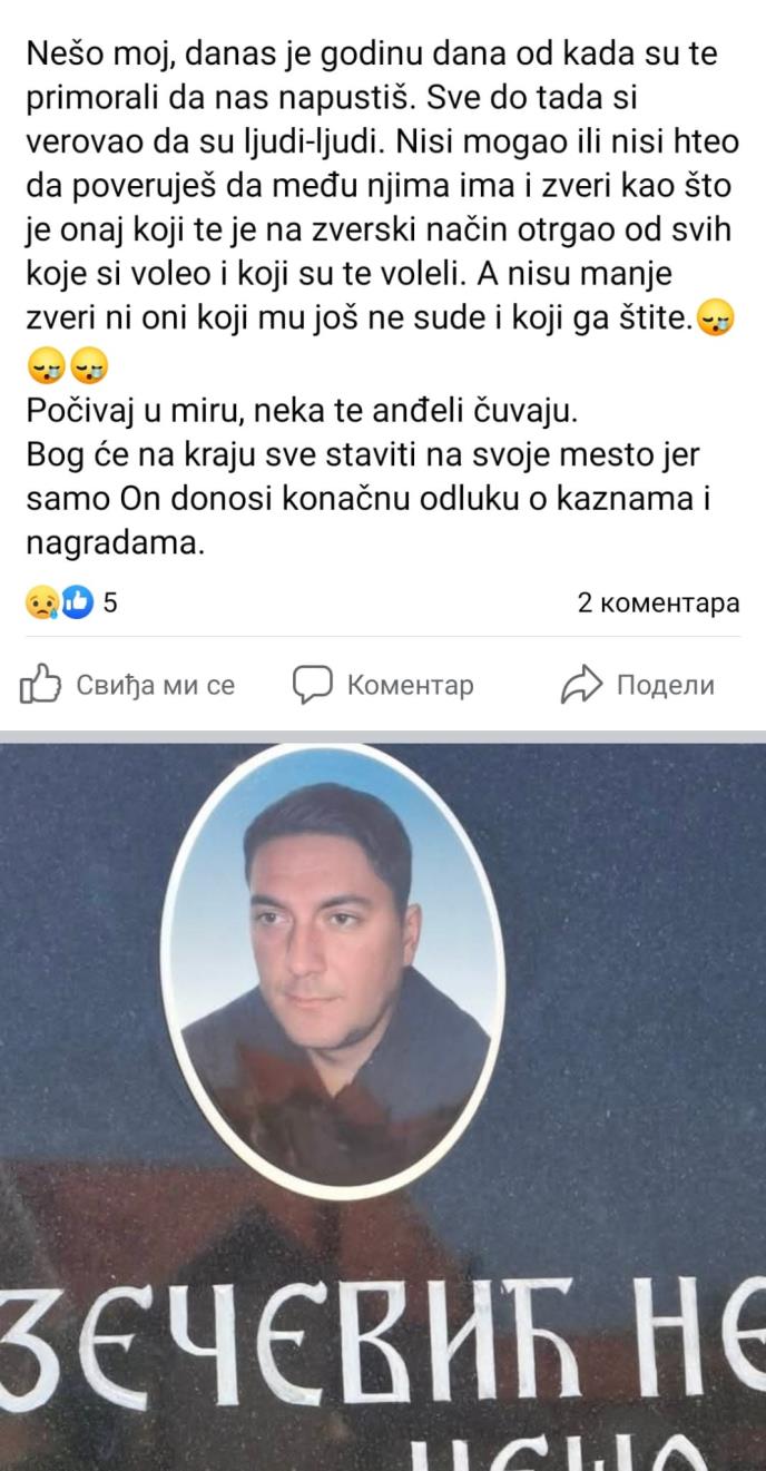 Nenadova tetka Dušica i danas, godinu dana kasnije, ne nalazi mir. Na svom Fejsbuk profilu podijelila je emotivnu poruku ispod fotografije nadgrobnog spomenika koji su njemu u čast podigli najbliži: