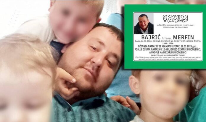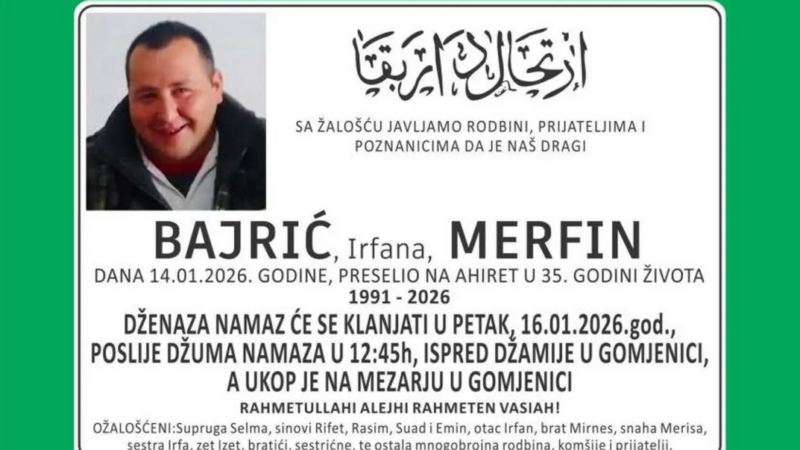 Džemat Gomjenica i šira prijedorska regija zavijeni su u tugu nakon vijesti da je u 35. godini života na ahiret preselio Bajrić Merfin, mladi suprug i otac četvero maloljetne djece. Merfinov prerani odlazak ostavio je duboku prazninu u porodici, ali i među komšijama, prijateljima i džematlijama koji ga pamte kao skromnog, vrijednog i porodičnog čovjeka. Iza njega su ostali supruga Selma i četvorica sinova: Rifet (10), Rasim (8), Suad (5) i Emin (2), kojima je otac bio oslonac i sigurnost.
