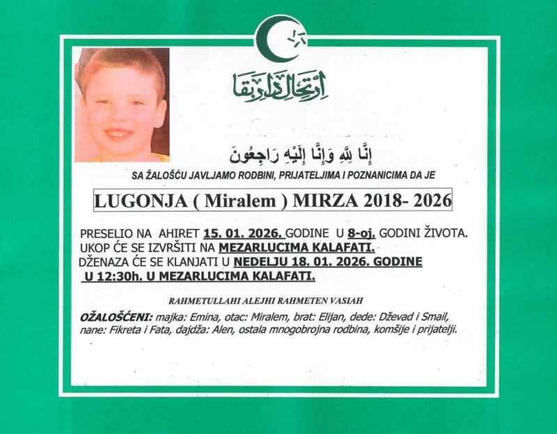 Postoje vijesti koje se ne čitaju – one se osjete. One zaustave dah, stegnu grudi i ostave čovjeka nijemog pred činjenicom da je jedan nevini život prerano preselio. Takva je i vijest da se Gospodaru svome vratio Mirza Lugonja, dijete Priboja, dijete Sandžaka. Mirza Lugonja (sin Miralema), rođen 2018. godine, preselio je na Ahiret 15. januara 2026. godine, u svojoj 8. godini života. Vijest o njegovoj preranoj smrti potresla je ne samo njegovu porodicu, već i cijeli Priboj i Sandžak, ostavljajući tugu koju je teško pretočiti u riječi.