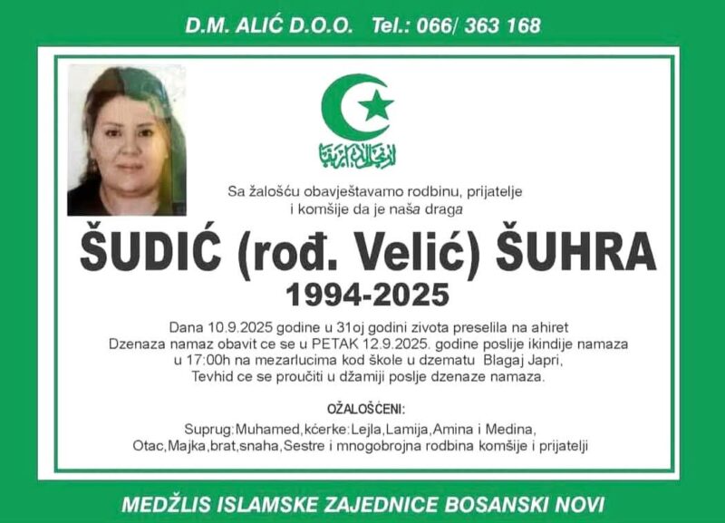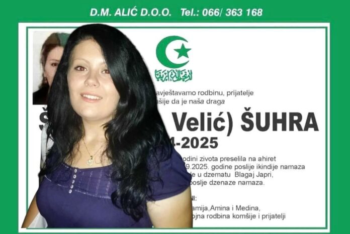 Vijesti o smrti uvijek nas zateknu, ali neke ostave dublji trag od drugih. Iz Doline Japre stigla je tužna vijest da je sa ovoga svijeta otišla Šuhra, Dada Velić – Šudić (1994–2025), mlada žena od samo 31 godinu i majka četvero djece. Najmlađa kćerkica, Medina, ima tek četiri mjeseca kada je ostala bez majke.