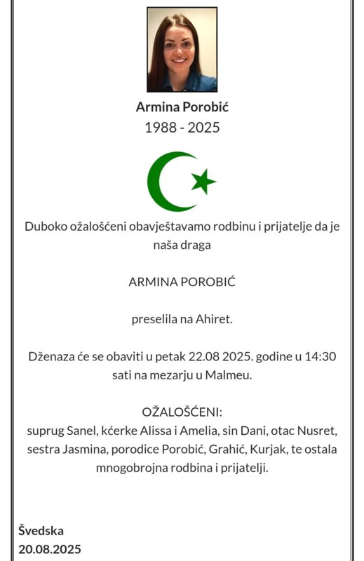 Bošnjačka zajednica u Švedskoj pogođena je teškom viješću – u 37. godini života na ahiret je preselila Armina Porobić (1988–2025).