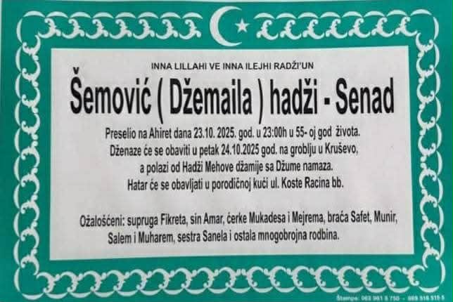 U ime džemata Hadži Mehove džamije, s dubokom tugom obavještava se javnost da je na ahiret preselio naš brat, hadži Senad (Džemaila) Šemović – Senko Kruševo, u 55. godini života.