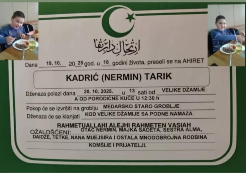 Dana 19. oktobra 2025. godine, u 18. godini života, na Ahiret je preselio Tarik Kadrić, sin Nermina i Sadete Kadrić iz Sjenice. Vijest o njegovom preseljenju potresla je cijelu Sjenicu, jer je ugašen život mladića koji je, i pored teške bolesti, u sebi nosio neizmjernu toplinu i vedrinu.