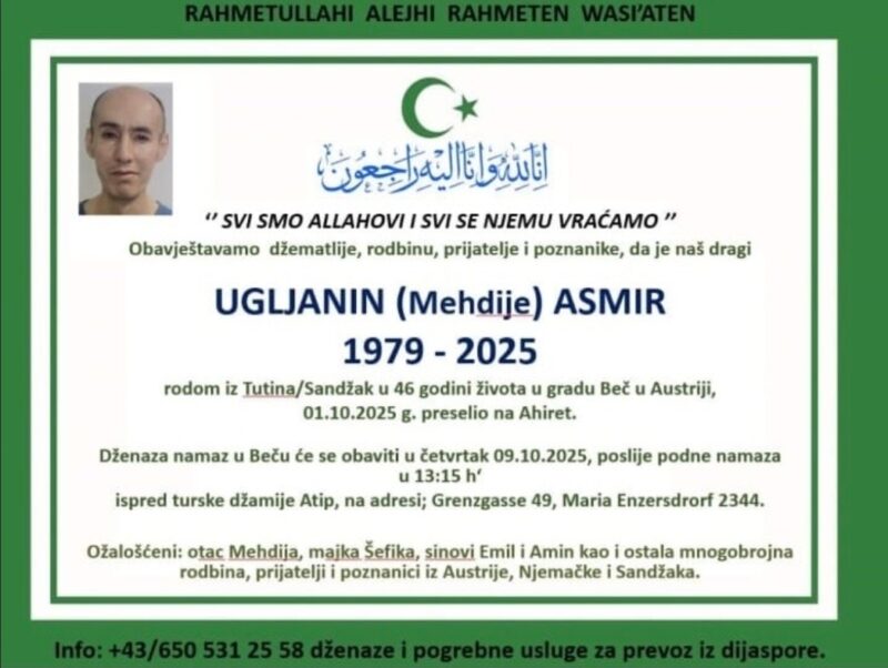 Dženaza Asmiru Ugljaninu bit će klanjana u četvrtak u Beču, gdje je živio i radio, nakon čega će njegovo tijelo biti prevezeno u rodno Dubovo kod Tutina. Druga dženaza i ukop obavit će se u prisustvu porodice, prijatelja i komšija koji će mu odati posljednju počast.