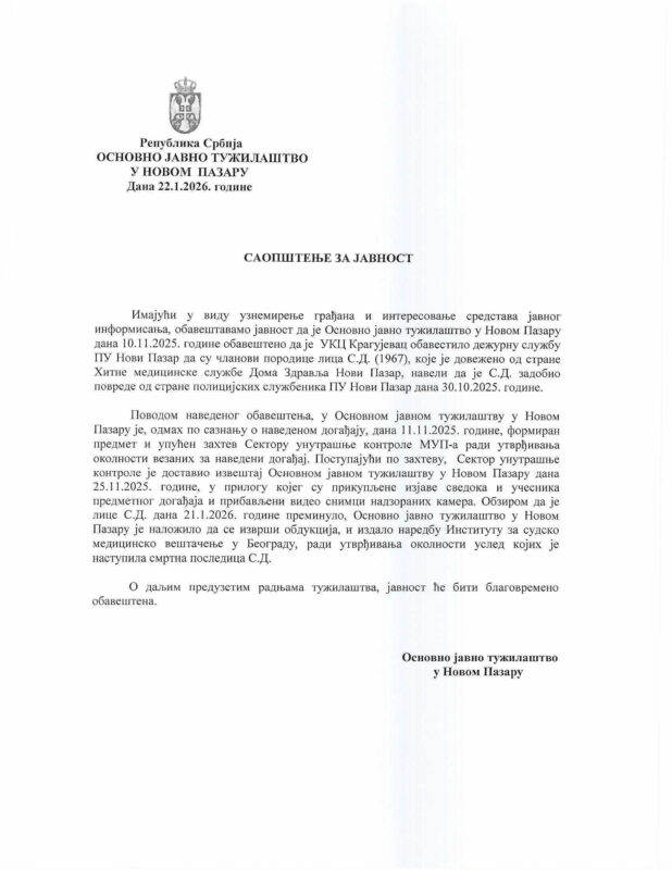 Novi Pazar – Osnovno javno tužilaštvo u Novom Pazaru oglasilo se zvaničnim saopštenjem povodom smrti Samira Dolovca (1967), koji je preminuo 21. januara 2026. godine, nakon što je prethodno zadobio povrede tokom postupanja policijskih službenika Policijske uprave Novi Pazar.