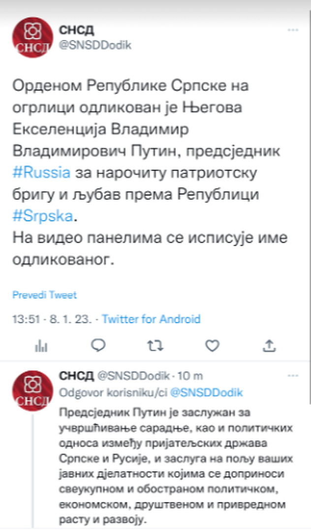 Podsjećamo, Dodik je jedan od rijetkih političara koji održava veze sa predsjednikom Ruske Federacije nakon njegove otvorene agresija na Ukrajinu u februaru prošle godine.